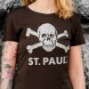 The classic FC St. Pauli Totenkopf is printed in white ink on a brown tee. This is printed on an American Apparel sheer jersey tee, which is lighter weight, slightly looser and much softer than your normal womens t-shirt.